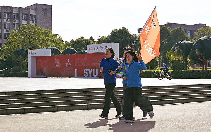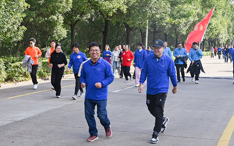 致辞结束后,现场举行了简短的授旗仪式。党委副书记、工会主席赵敏丽将象征着责任与使命的团旗分别授予教职工跑团与校友跑团代表。随后,发令枪响,清脆的枪声划破长空。在校领导宁立伟、赵敏丽、蒋剑平、黄秋生、唐杰的带领下,由校旗、工会会旗引领,各分工会组成的方阵队伍精神抖擞,依次从田径场跑道出发,开启了环绕校园的奔跑与步行。队伍宛如流动的彩带,途经步云桥、图书馆、明德大道等地标,矫健的身影与初冬的校园景致交织成一幅生动的画卷,沿途工作人员和大学生志愿者的保驾护航确保了活动的顺畅与安全。