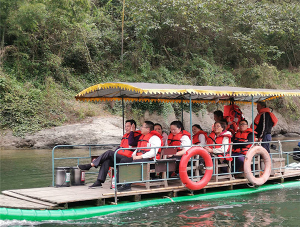 下午,驱车抵达夫夷江岸,江水清澈见底,平缓如镜。老师们分组乘坐竹筏顺水而下,全程约12公里,两岸青山绿树,田畴似锦,水光山色,清风习习,碧波漾漾。沿途观赏将军石、试剑石、团鱼石、军舰石、啄木鸟石等。其中,巍然屹立于夫夷江东岸山坡上的将军石,净高75米,周长40余米,远观酷似一位身披战袍,威风凛凛的大将军。山川秀丽,风光旖旎,如置身于画卷中,让大家一切烦恼荡然无存,欢快和谐。