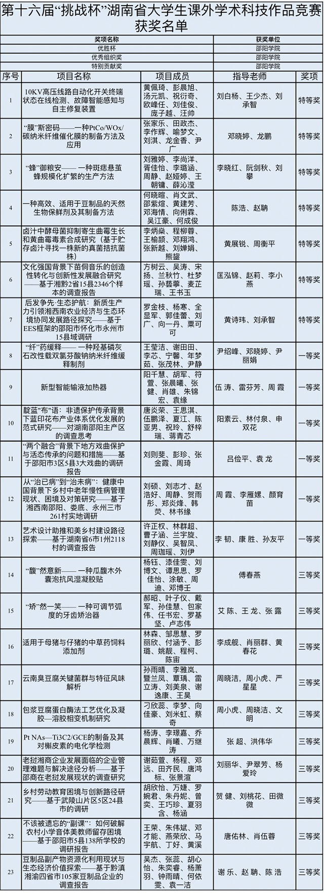 近日,第十六届“挑战杯”财信金控湖南省大学生课外学术科技作品竞赛完整获奖名单出炉。经过层层选拔与激烈角逐,我校选送的23件参赛项目全部获奖,实现省赛大满贯,其中特等奖7项,一等奖6项,三等奖10项,以团体分全省第二的好成绩再次捧得“优胜杯”和“优秀组织奖”,并首次捧得“特别贡献奖”,竞赛成绩取得历史性突破!