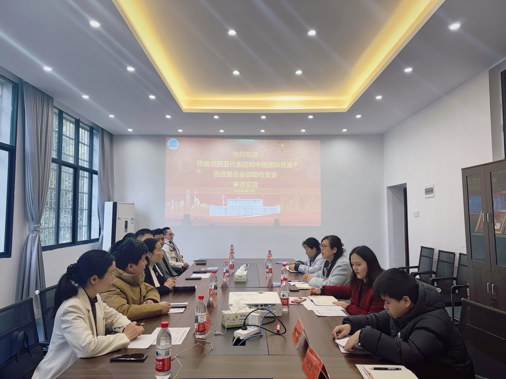 2026年3月17日下午,印度尼西亚来访团与中国国际贸易促进委员会邵阳市支会一行来校访问交流。国际学院党总支书记刘红新、国际学院副院长肖婷和国际交流处相关人员出席会议。座谈会由肖婷主持。