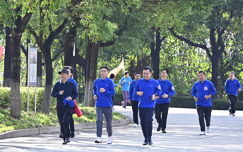 致辞结束后,现场举行了简短的授旗仪式。党委副书记、工会主席赵敏丽将象征着责任与使命的团旗分别授予教职工跑团与校友跑团代表。随后,发令枪响,清脆的枪声划破长空。在校领导宁立伟、赵敏丽、蒋剑平、黄秋生、唐杰的带领下,由校旗、工会会旗引领,各分工会组成的方阵队伍精神抖擞,依次从田径场跑道出发,开启了环绕校园的奔跑与步行。队伍宛如流动的彩带,途经步云桥、图书馆、明德大道等地标,矫健的身影与初冬的校园景致交织成一幅生动的画卷,沿途工作人员和大学生志愿者的保驾护航确保了活动的顺畅与安全。