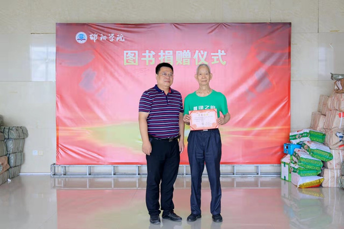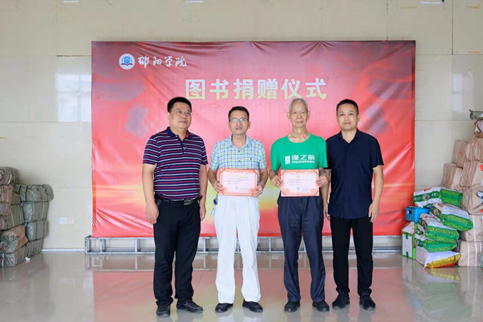 捐书仪式开始后,邵阳学院原组织部部长易江波对杨民贵的个人信息与捐赠目的进行了详细介绍。杨民贵,1939年2月生,湖南武冈人,1984年调邵阳日报任摄影记者,1997年被评聘为主任编辑。湖南省第二届“十佳”新闻工作者,一等功荣立者。政协邵阳市第四届、第五届委员会委员。现为中国摄影家协会会员,中国新闻摄影学会会员,中国民俗摄影协会会员。在全国各级报刊发表新闻照片和摄影艺术作品4000余幅,百余件作品获奖。退休以后,杨民贵拍摄、编辑、出版了自己的摄影作品集《人物篇》、《崛起的邵阳》、《荷韵》等,用照片记录了祖国的大好河山与家乡的变化发展,大大促进了邵阳旅游事业的发展。介绍完杨民贵的个人信息后,捐书仪式正式开始。杨民贵、易江波向图书馆进行了图书捐赠,图书馆副馆长朱鸿鹏、图书馆副馆长谭亮为杨民贵、易江波颁发捐赠证书并合影留念,向其表示了由衷的感谢,并表示一定充分利用好这些书籍,以使赠书能够最大限度为读者服务。