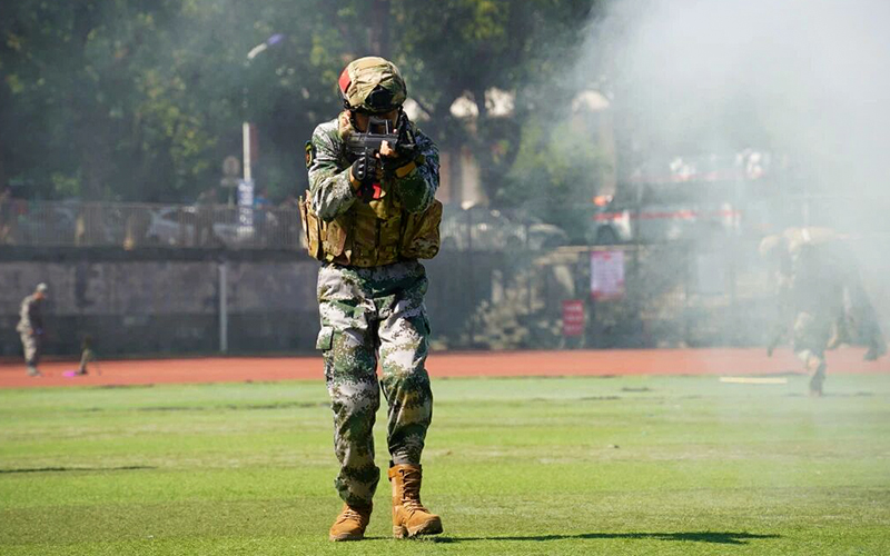 表演伊始,教官们以整齐划一的分列式入场,步伐铿锵,气势如虹。随后进行的战术动作展示惊心动魄,干净利落的擒拿动作与默契的战术配合,每一个动作衔接无缝,汗水顺着下颌滴落,却浇不灭眼神里的锐利锋芒,尽显过硬军事素养。现场硝烟弥漫,战术演练模拟真实场景,指挥果断、行动迅猛,赢得了师生们的阵阵掌声与喝彩。
