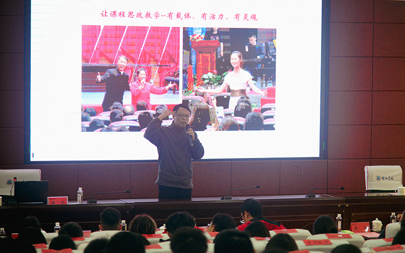 下午的分享会由校党委委员、副校长唐杰主持。分享主题为“谱青春旋律 铸时代理想”,聚焦于如何用音乐激发青年的理想与担当。湖南农业大学马克思主义学院院长胡艺华教授作了《像青年袁隆平那样有理想》的主题分享,并指出,湖南校园好声音活动“用思政为音乐注入灵魂,用音乐为思政插上翅膀”,是一种全新的思政教育模式创新。湖南师范大学陈刚教授、吉首大学周礼副教授等也先后登台,分享了在音乐类课程中融入思政教育,以及通过“四融”交响谱写育人乐章的具体路径。邵阳学院周晓岩副教授立足贺绿汀精神,总结该校“品牌活动+教学改革+协同育人”的音乐思政路径。