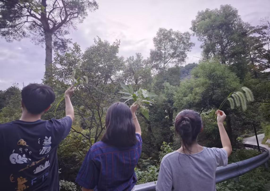 活动没有冗长的讲座,只有有趣的体验。大家闭上双眼,聆听鸟鸣、风声与树叶的簌簌声响,触摸树皮的纹理,轻嗅草木的清香,通过调动听觉、触觉、嗅觉等多重感官,逐步卸下日常学习生活的疲惫,快速融入自然环境。