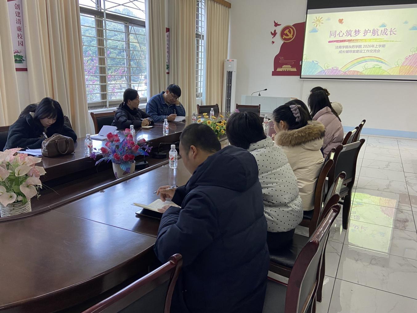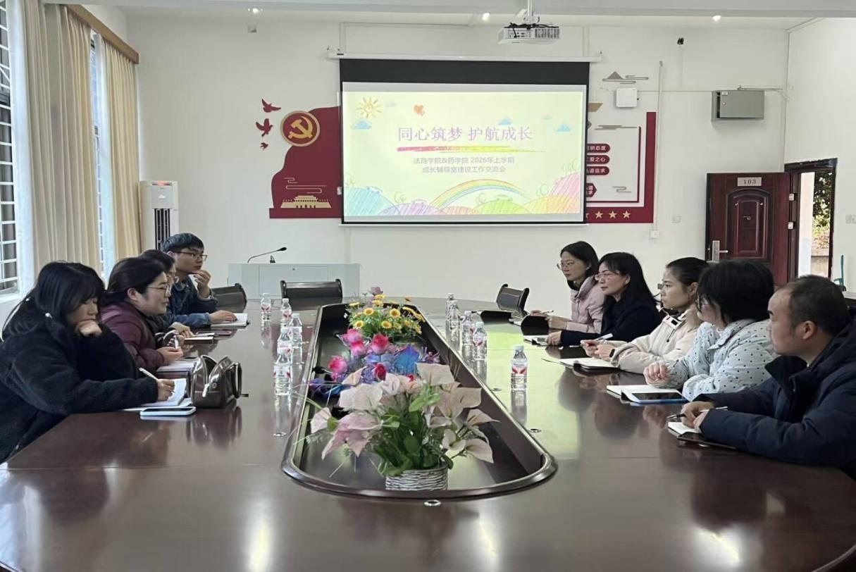 为深入贯彻落实高校立德树人根本任务,搭建跨学院成长辅导工作交流平台,整合学科育人资源,破解学生成长辅导工作难题,全面提升成长辅导室建设水平与育人实效,3月17日,药学院与法商学院联合举办2026年上学期“同心筑梦,护航成长”成长辅导室建设工作交流会。两学院党总支副书记及全体辅导员齐聚一堂,围绕成长辅导室规范化运营、特色化打造、协同化育人等核心议题展开深度交流研讨,共商学生成长护航新路径。