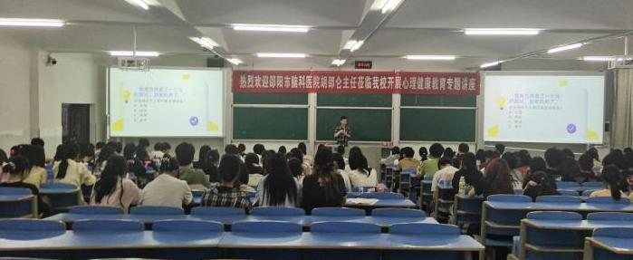 为提升朋辈心理互助员专业技能,筑牢学生心理健康防线, 5 月 29 日晚上,由学生工作部主办、校心理健康中心和一站式学生社区承办的心理健康知识讲座在明德楼T6教室进行,讲座特邀邵阳市脑科医院胡邵仑主任主讲,参加此次培训的有心理健康中心专职教师、各学院朋辈心理互助员代表等300余人参加。