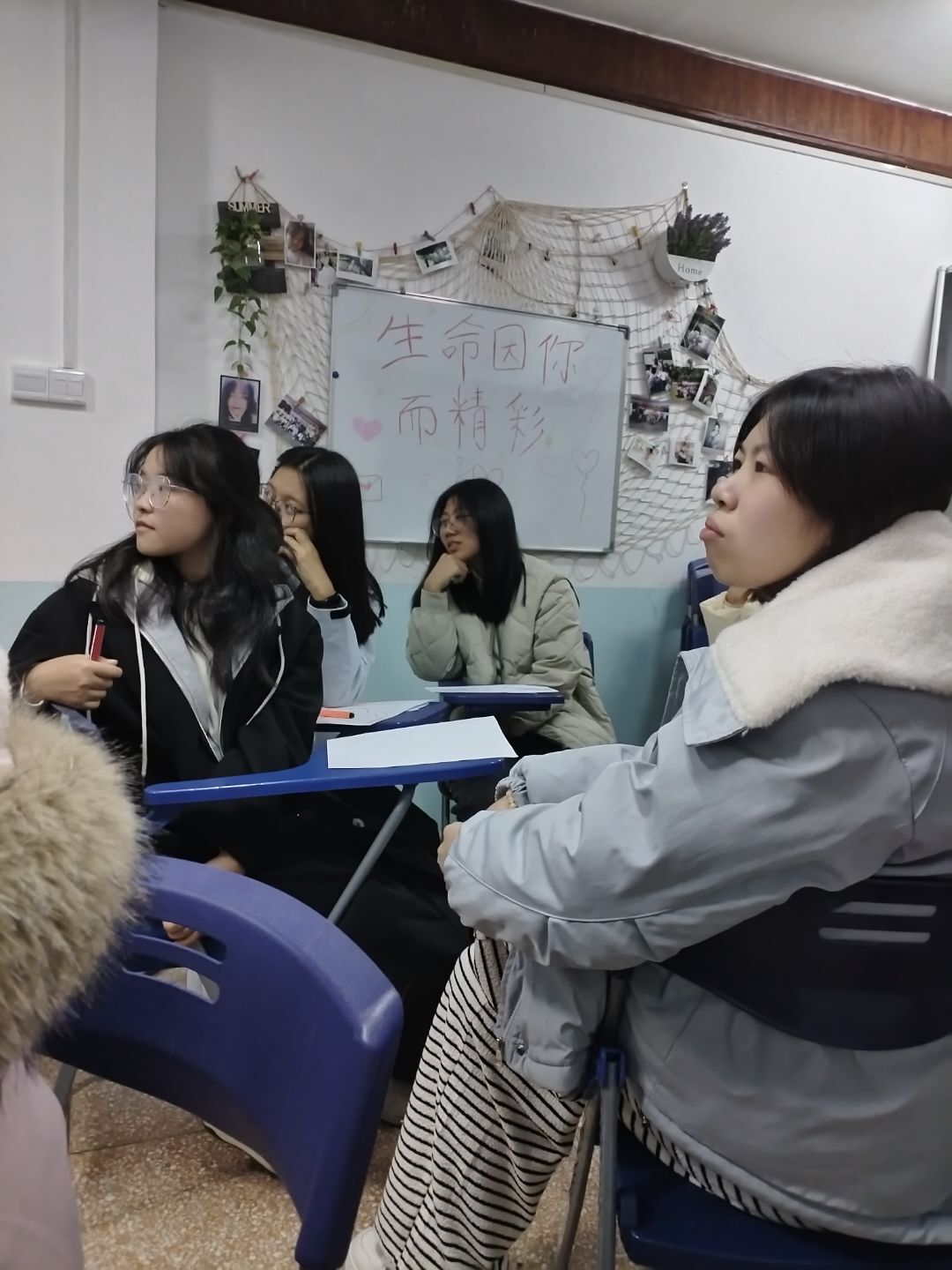 2025年12月7日晚19:00,“生命因你而精彩”主题团体辅导活动在李子园校区泽园二楼活动室顺利开展。本次活动由24级小助教张依萱担任领导者,龙兰馨、黄涵担任助手,全体25级小助教共同参与。