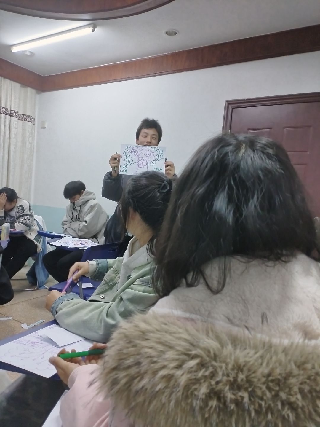 团辅设置了多个互动环节,旨在帮助成员们在轻松愉快的氛围中增进了解、感悟生命。活动伊始,“成长三部曲”热身游戏迅速点燃现场热情,成员们在欢声笑语中拉近了心理距离,现场气氛热烈活跃。随后进行的“生命撕纸”环节,成员们跟随指导,通过折叠与裁剪,直观感受到时间的流逝与有限。面对手中所剩的“时光纸片”,不少成员由衷感叹生命短暂,更觉珍惜当下之重要。最后,“沧海一粟”环节以画树与对话的形式展开。每位成员描绘属于自己的生命之树,并写下与树的私语,在分享与讨论中,进一步思考生命的意义与价值。透过创作与交流,大家深刻体会到:生命虽如沧海一粟,却因经历、连接与感悟而显得珍贵。