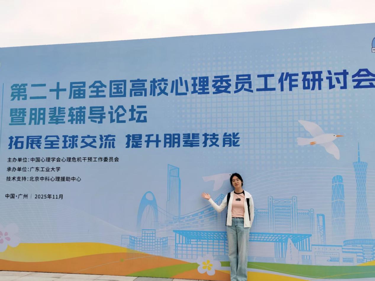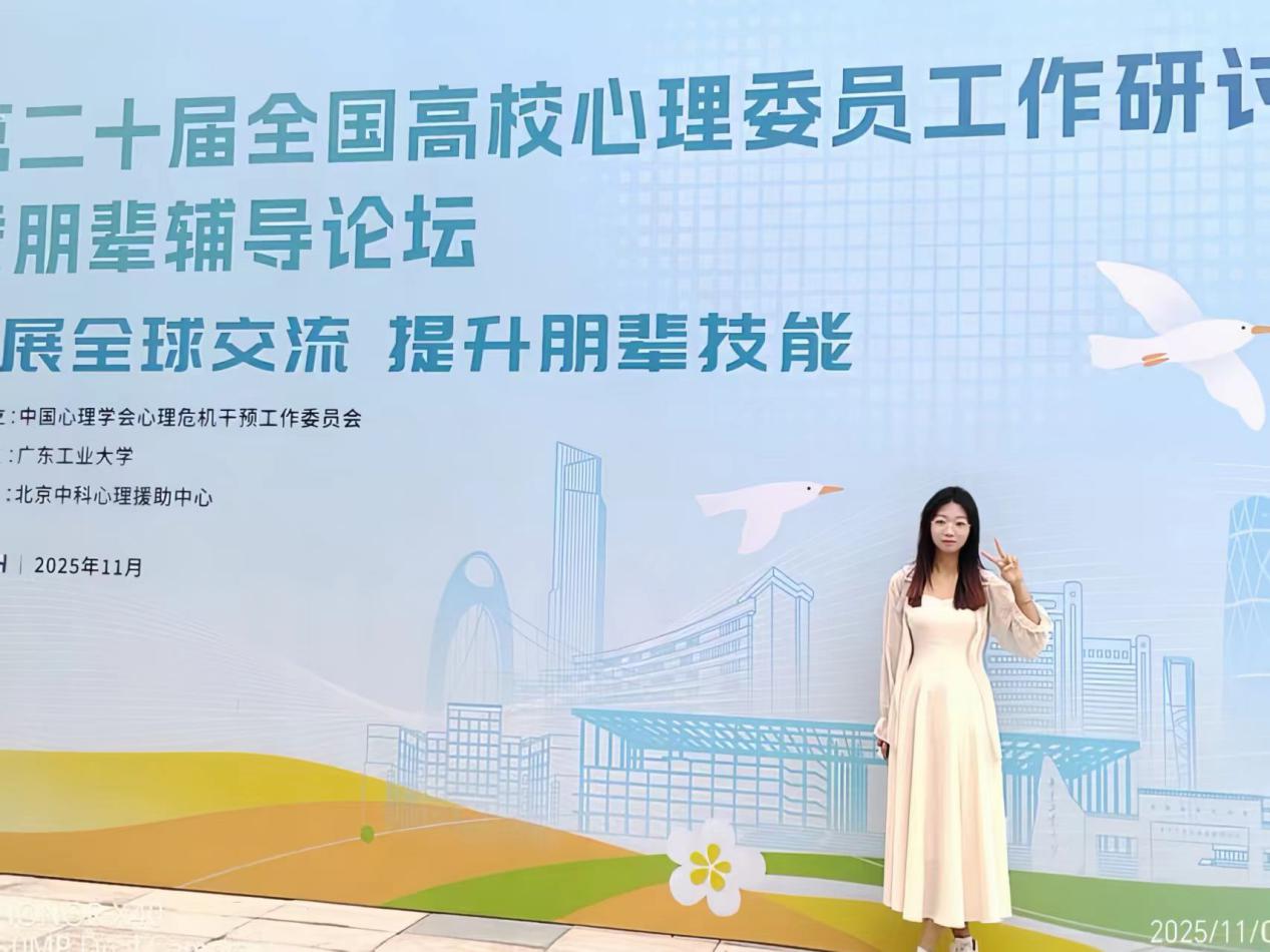 2025 年 11 月 5 日至 7 日,由中国心理学会心理危机干预工作委员会主办、广东工业大学承办的第二十届全国高校心理委员工作研讨会暨朋辈辅导论坛在广州隆重召开。本届大会以 “拓展全球交流,提升朋辈技能” 为核心议题,汇聚了来自国内外知名高校、研究机构的专家学者及高校心理健康教育工作者、朋辈心理骨干代表,共同探索新时代心理育人工作的创新路径。我校大学生心理健康教育中心李盈霏老师带队,携优秀朋辈心理干部宋晨嘉、王曼语参加此次盛会,续写我校在朋辈心理工作领域的交流成果。