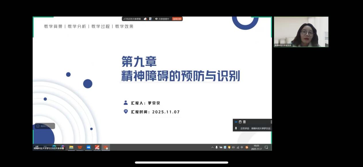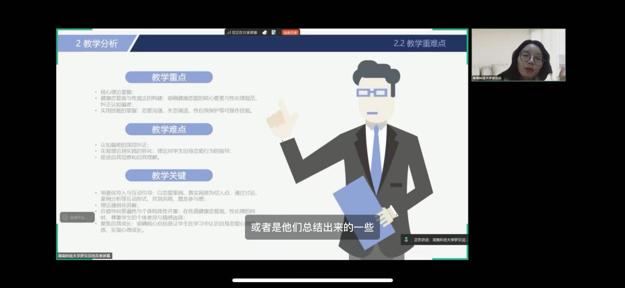 为持续提升心理健康教育教学质量,深化课程内涵建设,11月7日上午8:30-11:30我校心理健康教育教研室邀请了湖南科技大学心理教研室的罗贝贝老师通过腾讯会议的形式开展关于大学生恋爱心理、常见精神疾病主题的集中磨课,从课程导入、学生互动、教学高阶性、挑战度和课程思政几个维度进行了经验分享。