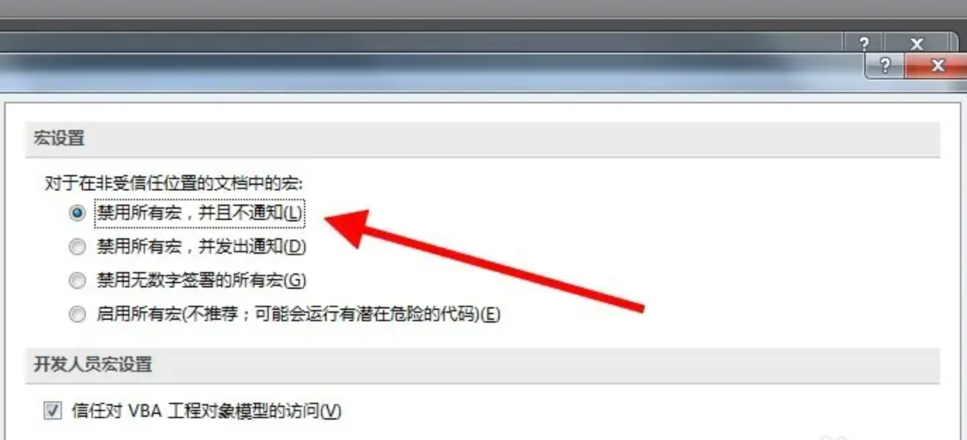 (4)勾选禁用所有宏,并且不通知 → 确定保存
