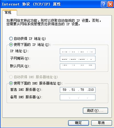 如上图所示,将首选DNS服务器设置为59.51.78.210,点确定返回即可。