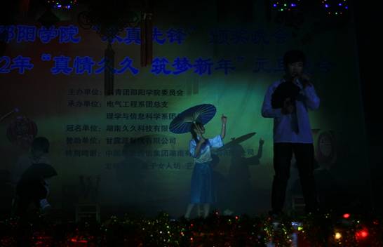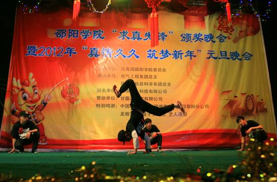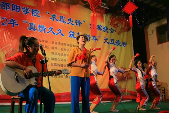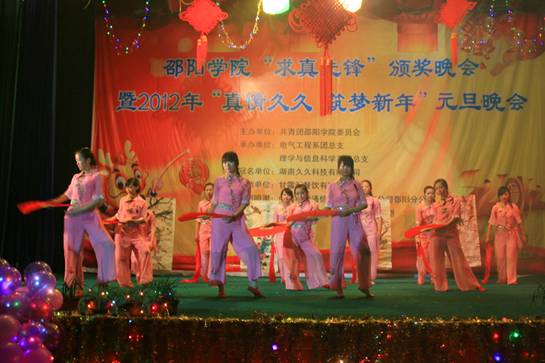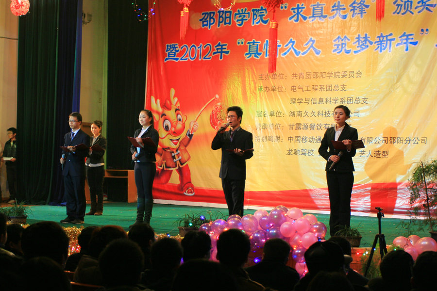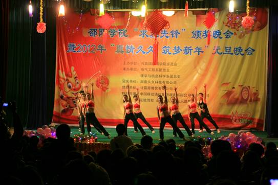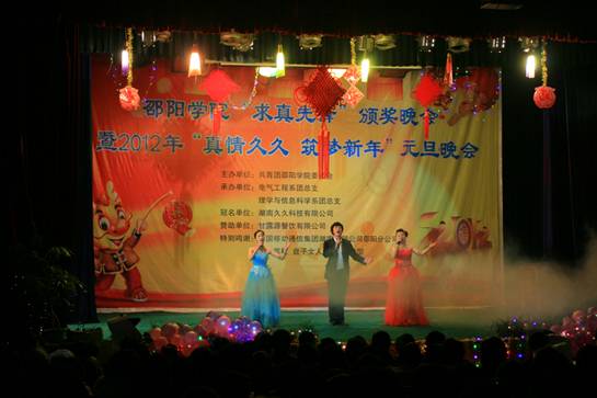 12月29日晚7时30分,由共青团邵阳学院委员会主办,电气工程系、理学与信息科学系承办的邵阳学院“求真先锋”颁奖晚会暨2012年元旦晚会在七里坪校区隆重举行。院长曹健华,副院长曾宝成,党委副书记陈晓飞,副院长曾阳素、洪振华、袁曦、陆步诗,副院级督导孙延斐,院长助理唐国华,以及学校各机关单位及各部门领导以及各系负责人应邀出席,与到场的一千余名师生共济一堂,兴致勃勃地观看晚会。