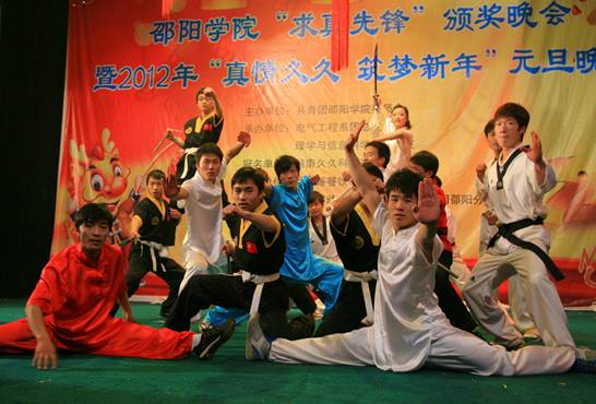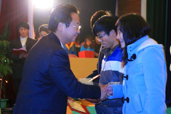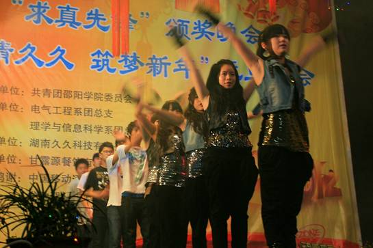 在晚会上,主持人还宣布了邵阳学院“求真先锋”的获奖名单,由校领导为获此荣誉的20位同学颁奖。“求真先锋”评选是我校建设“求真工程”的一项重要内容,这20位“先锋”分为“品学先锋”、“自强先锋”、“科研先锋”、“技能先锋”、“低碳先锋”、“创业先锋”以及“团队先锋”7个类别,均经过各系团总支推荐、主办单位初选、专家评审团面试和综合评定几个环节评选而来。“品学先锋”为中文系的余进美、机械系的熊勇、音乐系的卢叶子;“自强先锋”为生化系的乐一鸣、体育系的尹艳艳、政法系的吕丽、艺设系的赵望来;“实践先锋”为理学系的池菁菁、外语系的谢梦瑶、中文系的吴湘、经管系的谢莹;“创业先锋”为机械系的谭鹏飞、经管系的陈皖;“科研先锋”为机械系的廖辉辉、艺设系的卫光耀;“技能先锋”为外语系的宋佳妮、电气系的王远驰;“低碳先锋”为外语系的王小静、城建系的郑小包;“团队先锋”则是电气系的“电气TIGER创新团队”。